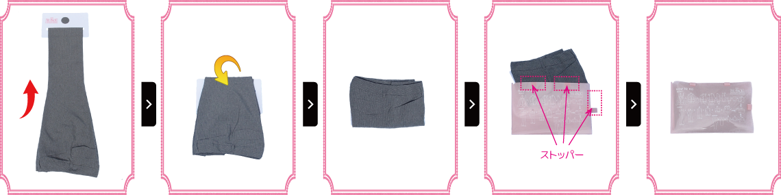 | ①スクロールホルダーのスリットに、パンツを通します。 | ②スクロールホルダーを回転させてパンツを巻いていきます。 | ③パンツの長さにより巻き終わりの長さが異なりますので、スリットを最初に通す時の長さをご自身で調整してください。 | ④パウチインナーケースに入れて、 | ⑤ストッパーを止めます。 | ||||